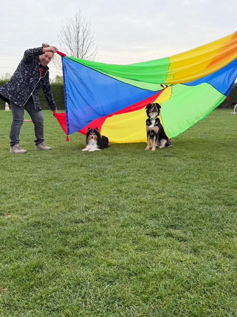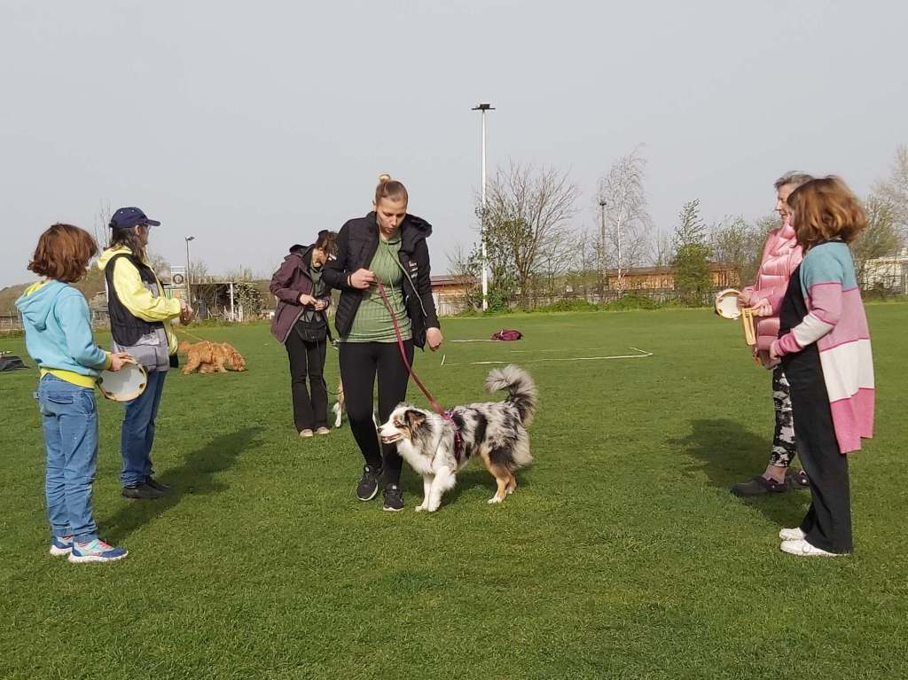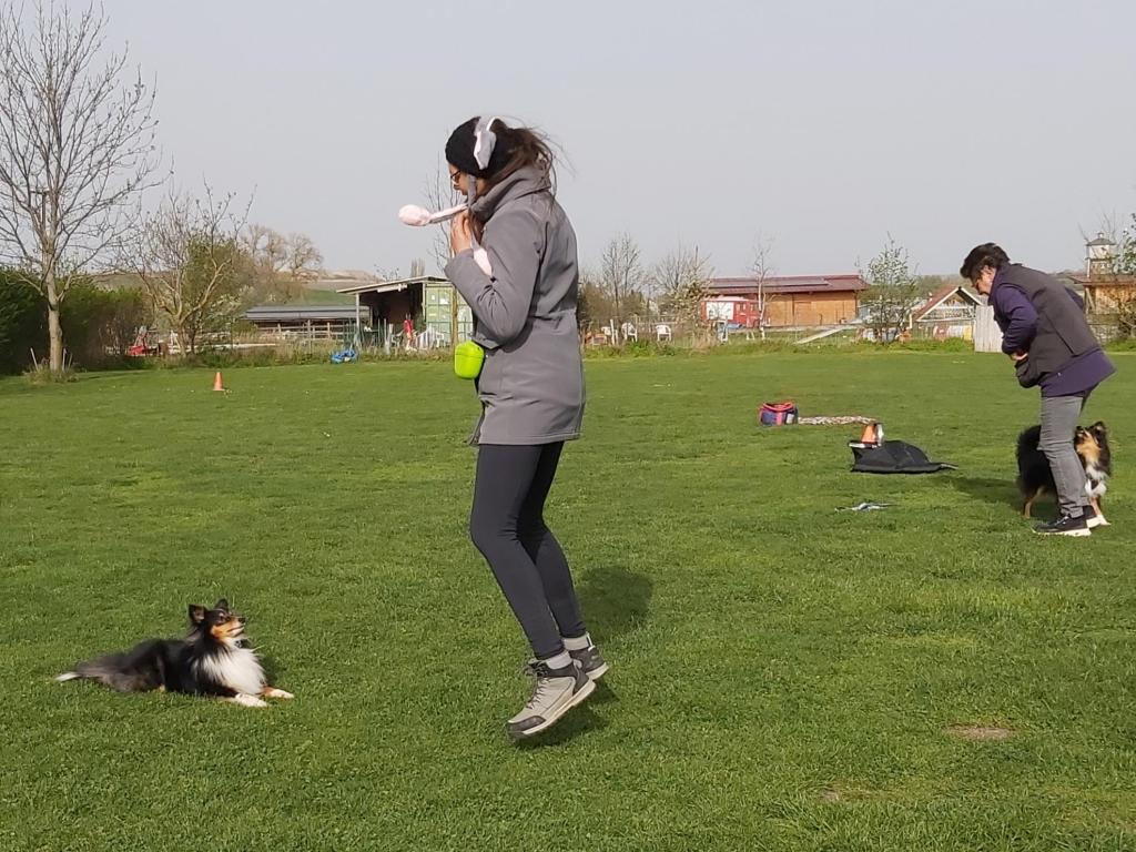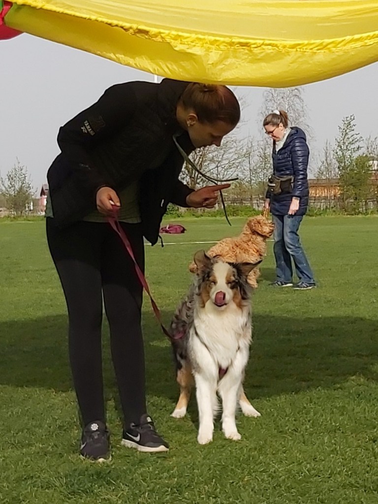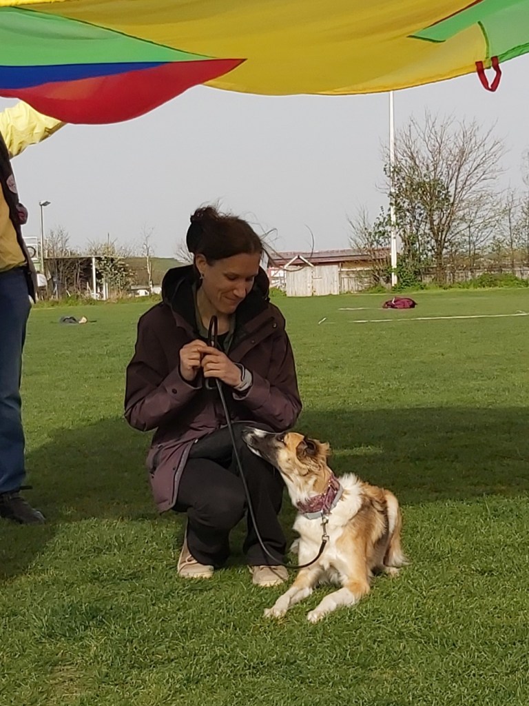 Stürmisch, kunterbuntes Ostertraining: Das flatternde Schwungtuch 👻- Geräuschegasse 🔔🥁 – Geduld üben wenn die Menschen hüpfen, springen und sogar über den Hund steigen – Medical Training 🏥👨🏼⚕️(Shirt und Socken, mit der Hoffnung, dass sich unsere Hunde nie verletzen 😊) – Sitzgasse (… und die Hunde durften gar nicht schmusen und küssen 🤪)