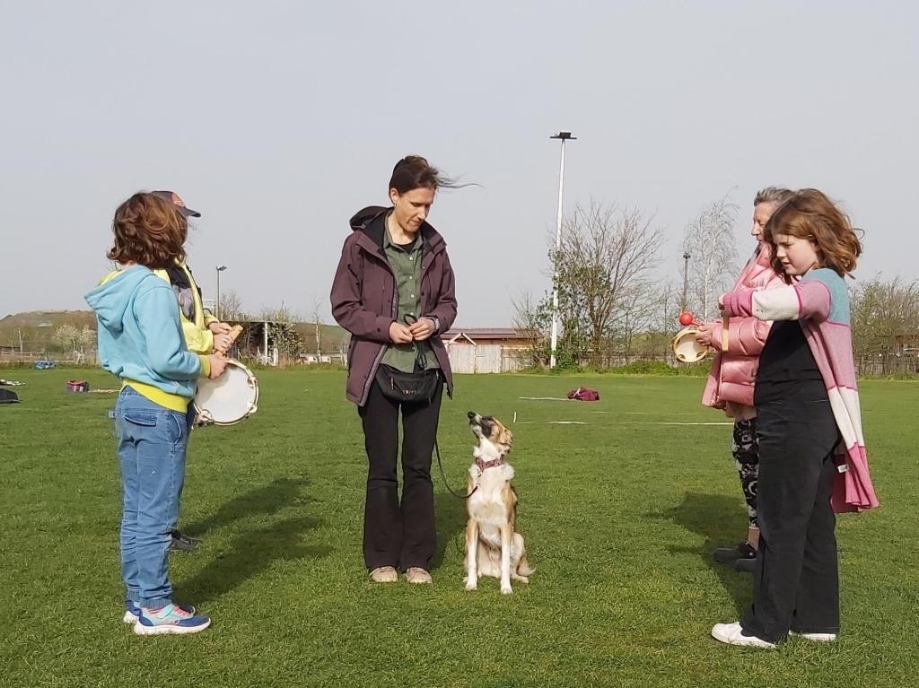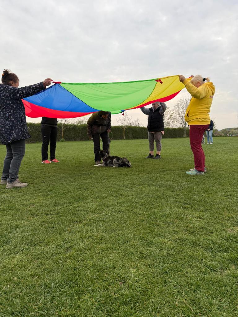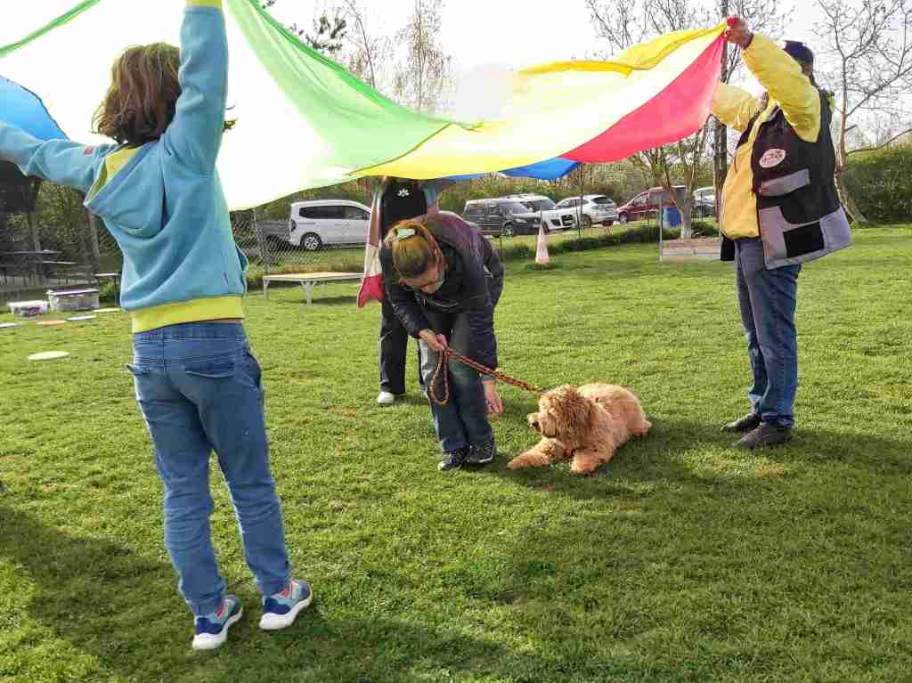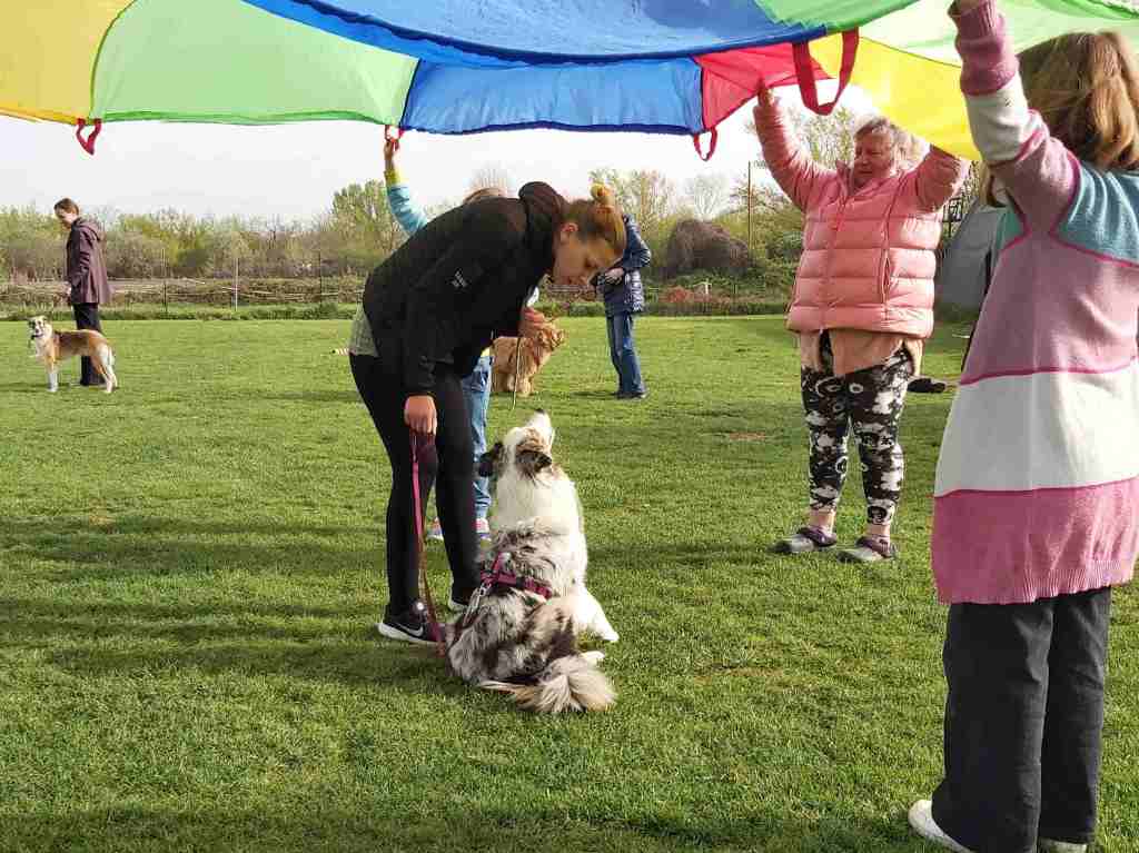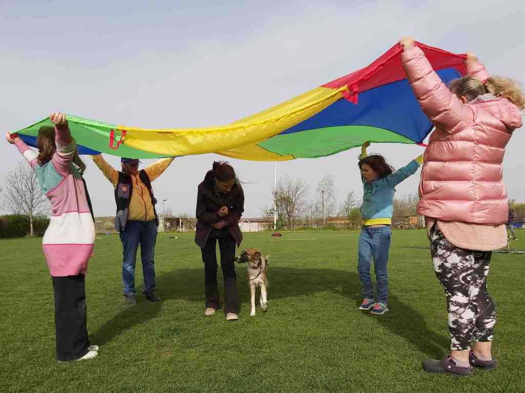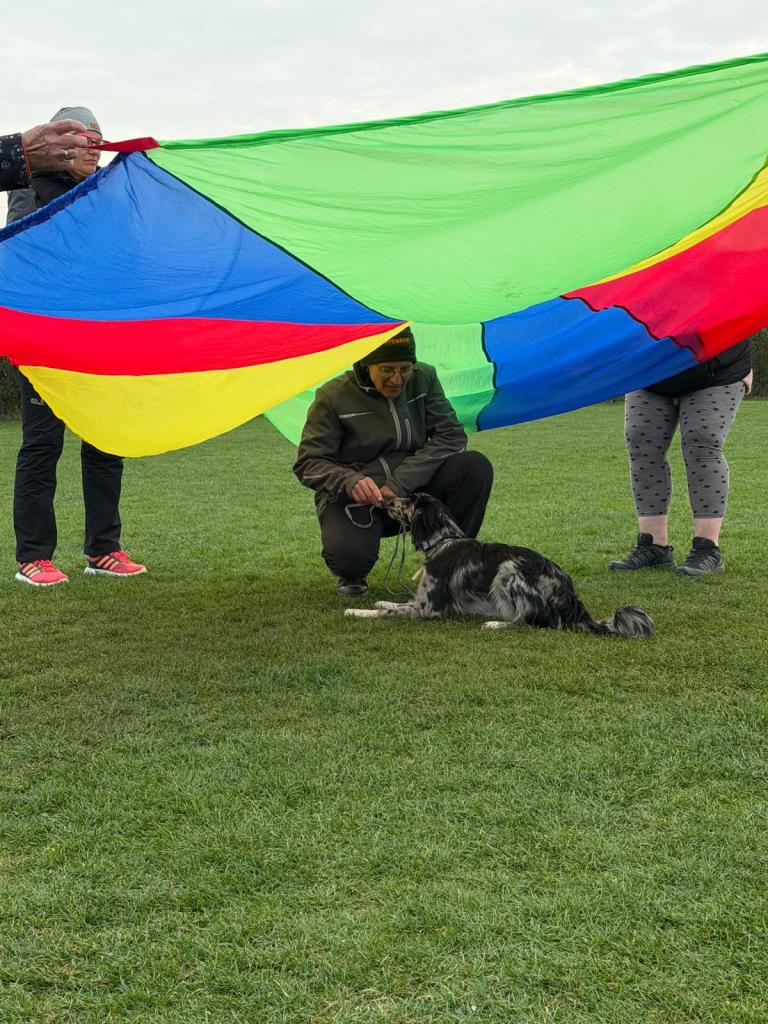 Stürmisch, kunterbuntes Ostertraining: Das flatternde Schwungtuch 👻- Geräuschegasse 🔔🥁 – Geduld üben wenn die Menschen hüpfen, springen und sogar über den Hund steigen – Medical Training 🏥👨🏼⚕️(Shirt und Socken, mit der Hoffnung, dass sich unsere Hunde nie verletzen 😊) – Sitzgasse (… und die Hunde durften gar nicht schmusen und küssen 🤪)