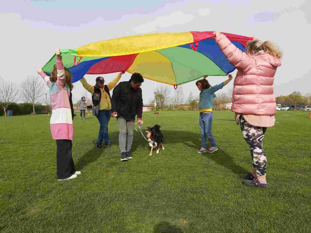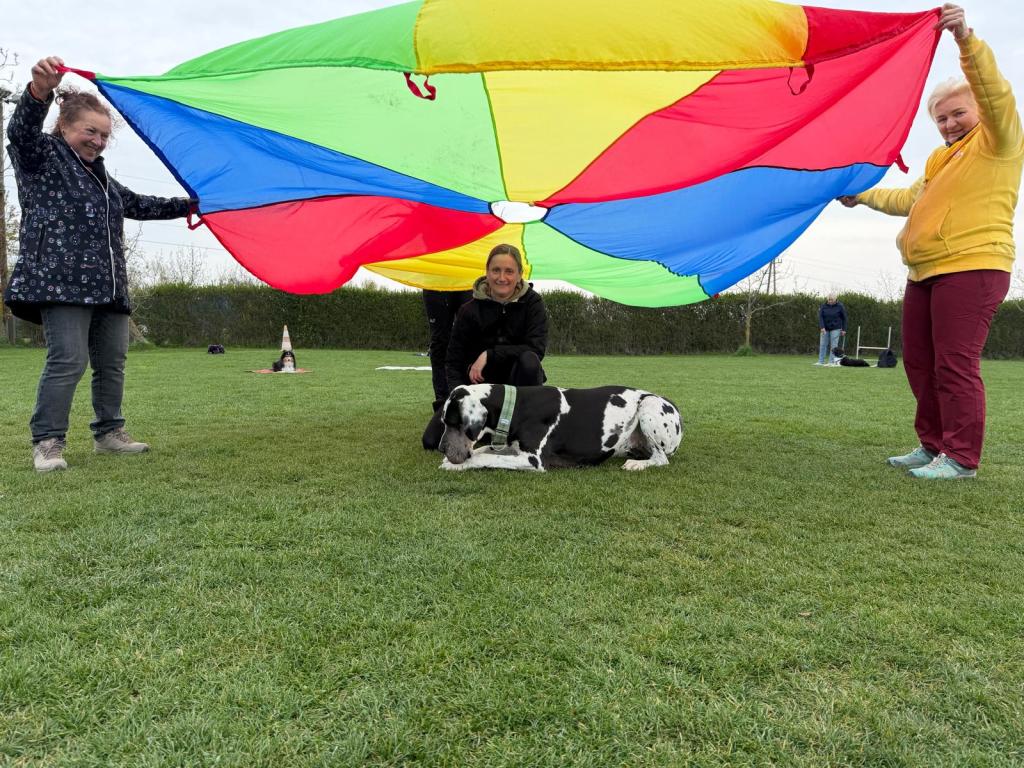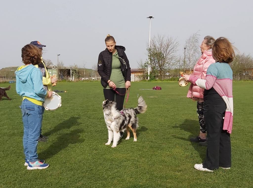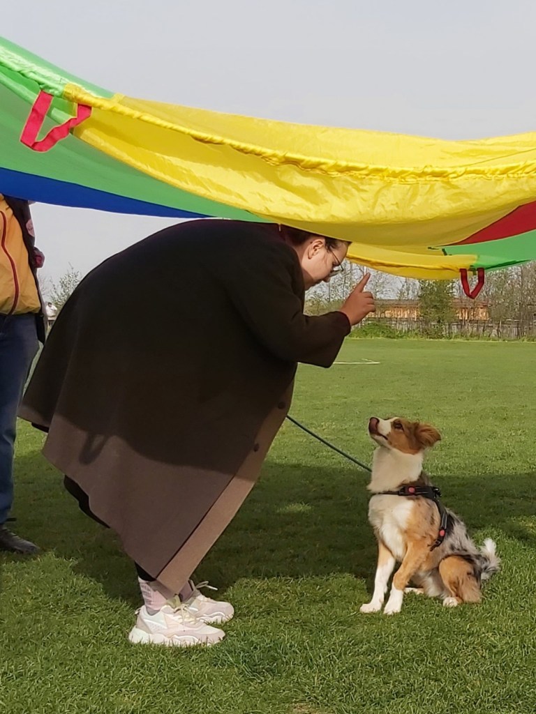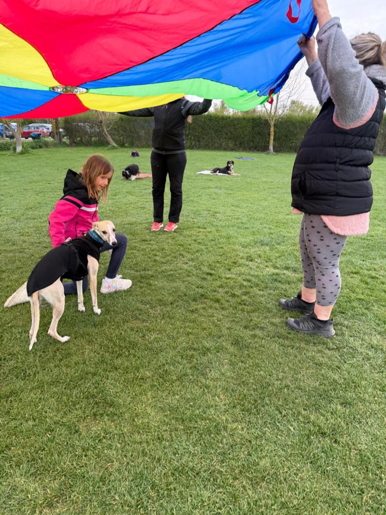 Stürmisch, kunterbuntes Ostertraining: Das flatternde Schwungtuch 👻- Geräuschegasse 🔔🥁 – Geduld üben wenn die Menschen hüpfen, springen und sogar über den Hund steigen – Medical Training 🏥👨🏼⚕️(Shirt und Socken, mit der Hoffnung, dass sich unsere Hunde nie verletzen 😊) – Sitzgasse (… und die Hunde durften gar nicht schmusen und küssen 🤪)